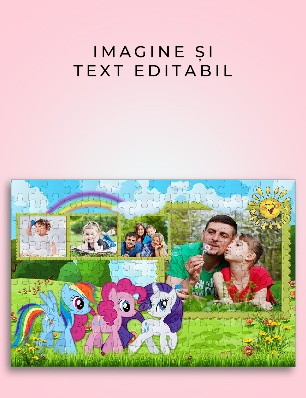 Oferă copiilor o experiență de neuitat cu puzzle-ul personalizat Sublima, cu personaje inspirate din desenele animate cu Unicorni! Disponibil în două mărimi: A4 (297×208 mm, 120 piese) și A3 (420×300 mm, 300 piese), fabricat din carton rezistent.